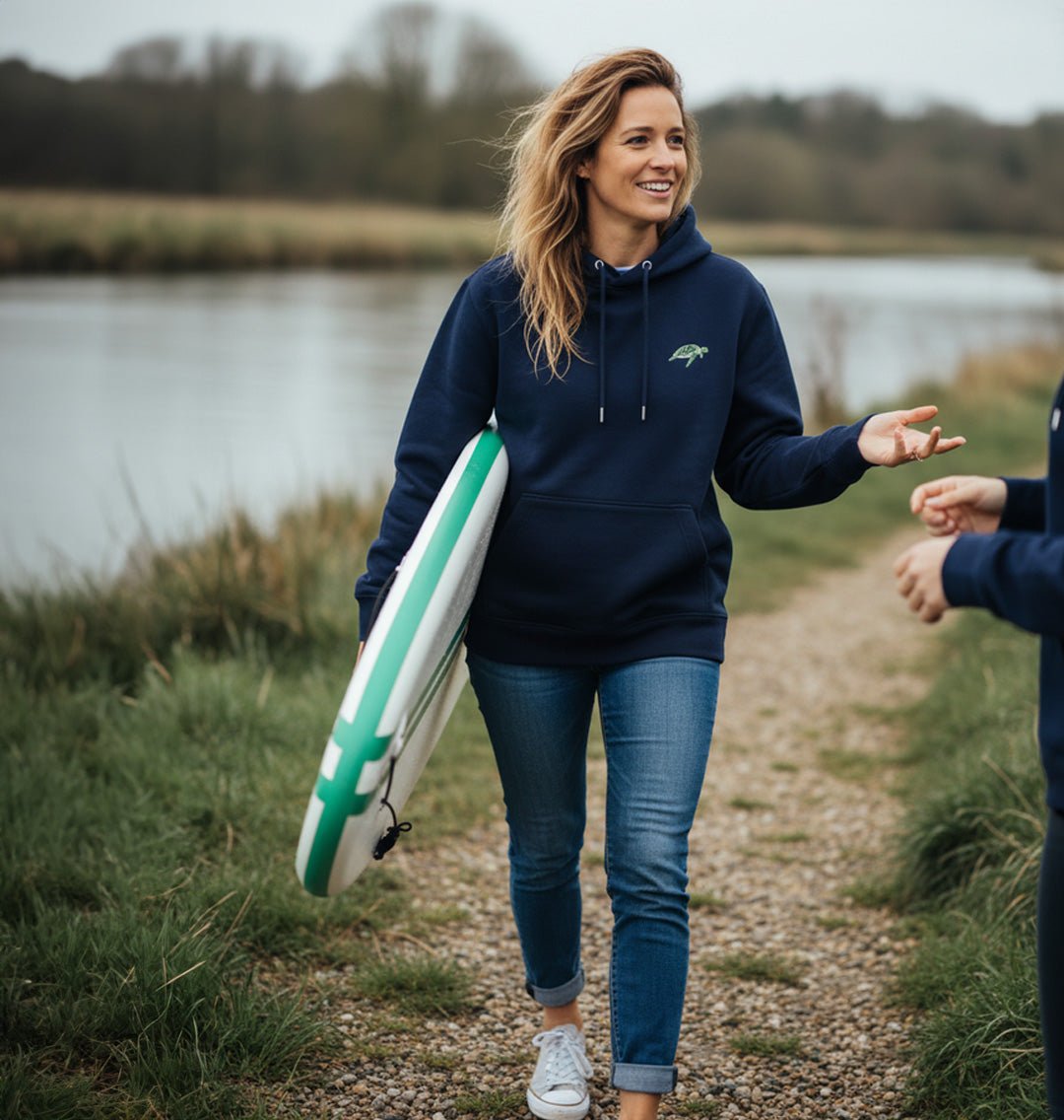 Dive into the oceanic world with this sustainable turtle awareness hoodie. Featuring an embroidered Sea Turtle on the front, this hoodie is perfect for all turtle lovers and supporters of sea life conservation.